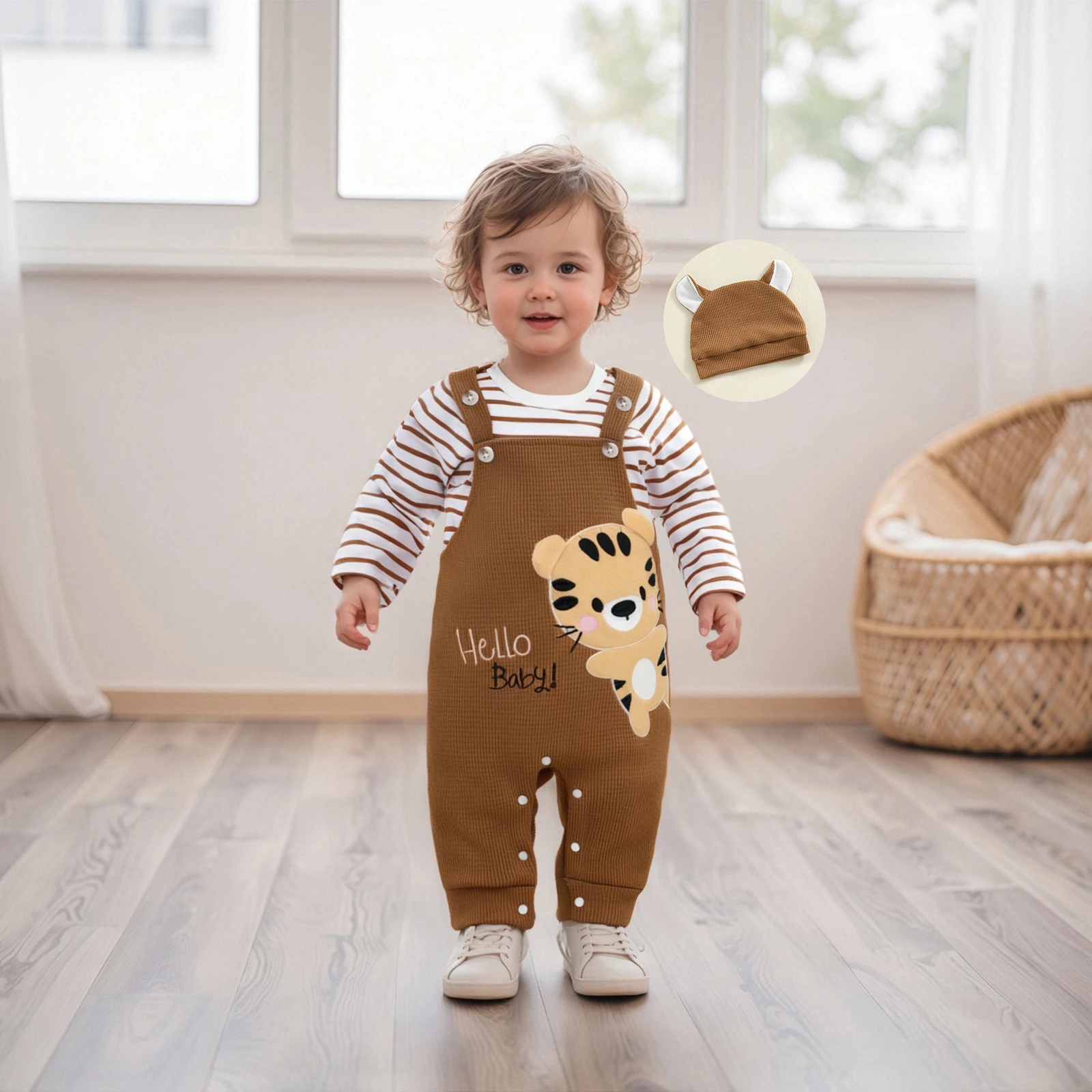 This adorable 3-piece outfit set combines style and comfort, making it a must-have addition to your baby boy’s wardrobe. The long sleeve striped romper is designed with a playful touch featuring tiger embroidery on the overalls, ensuring your little one looks fashionable while staying cozy. Perfect for any occasion, this outfit is ideal for playdates, family gatherings, or simply lounging at home.