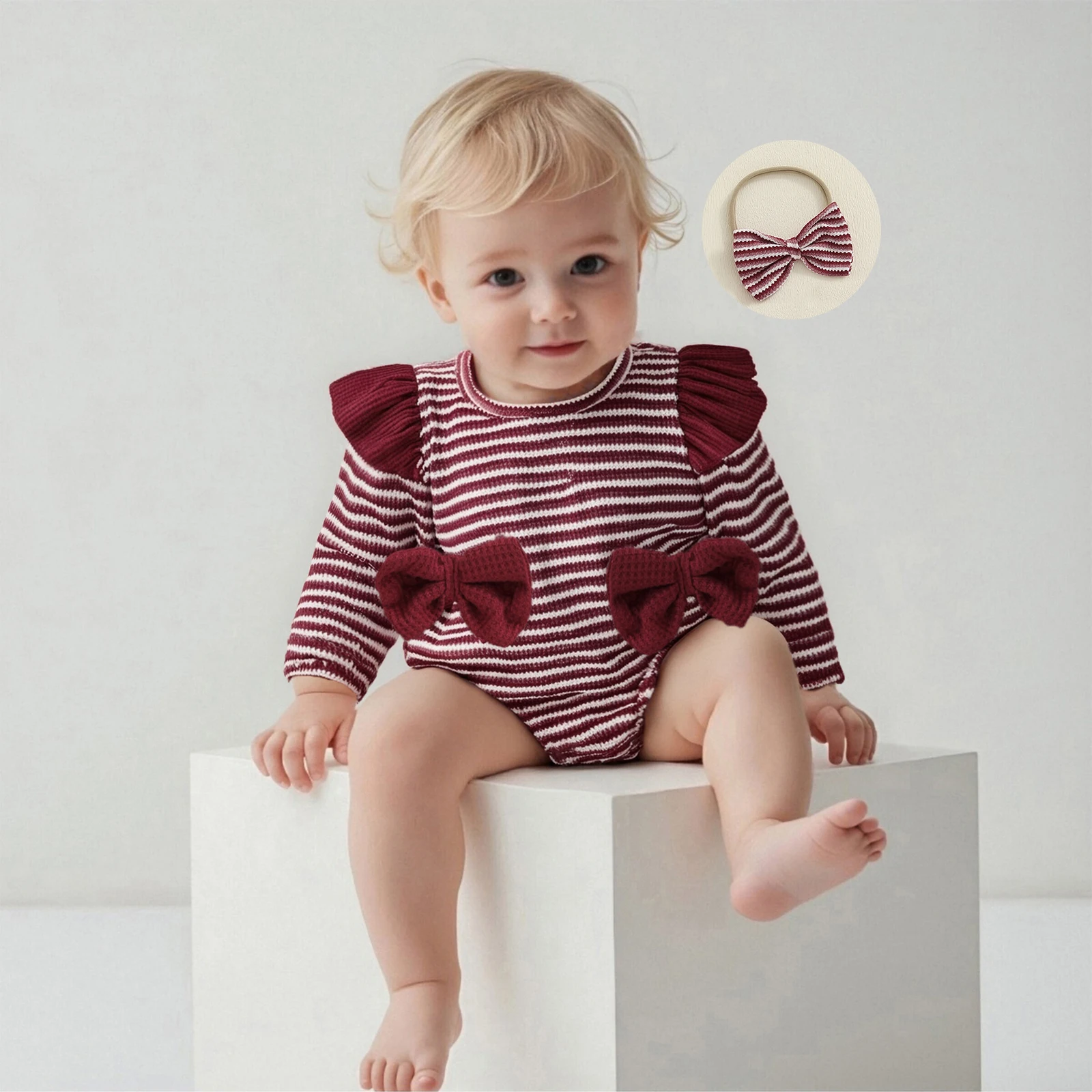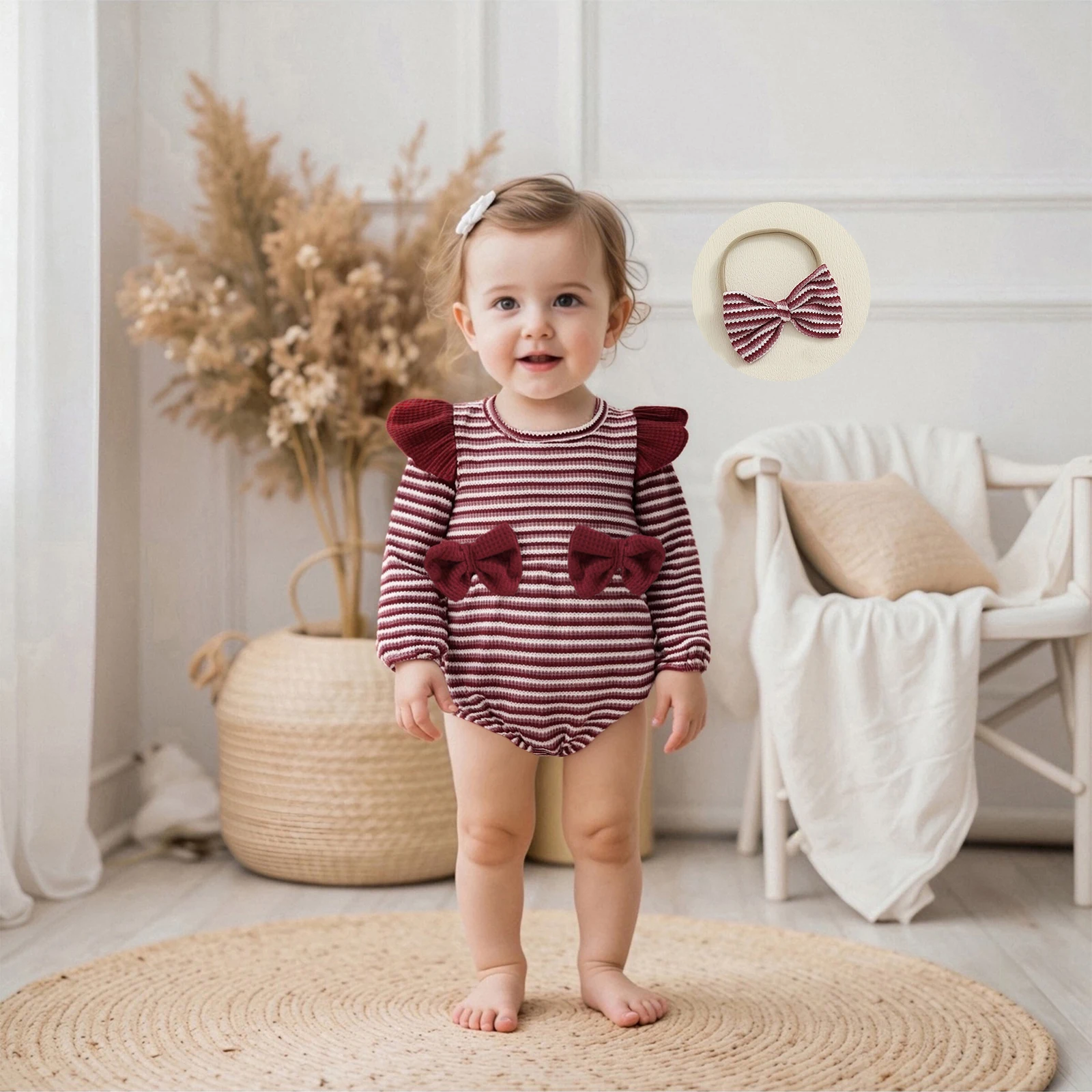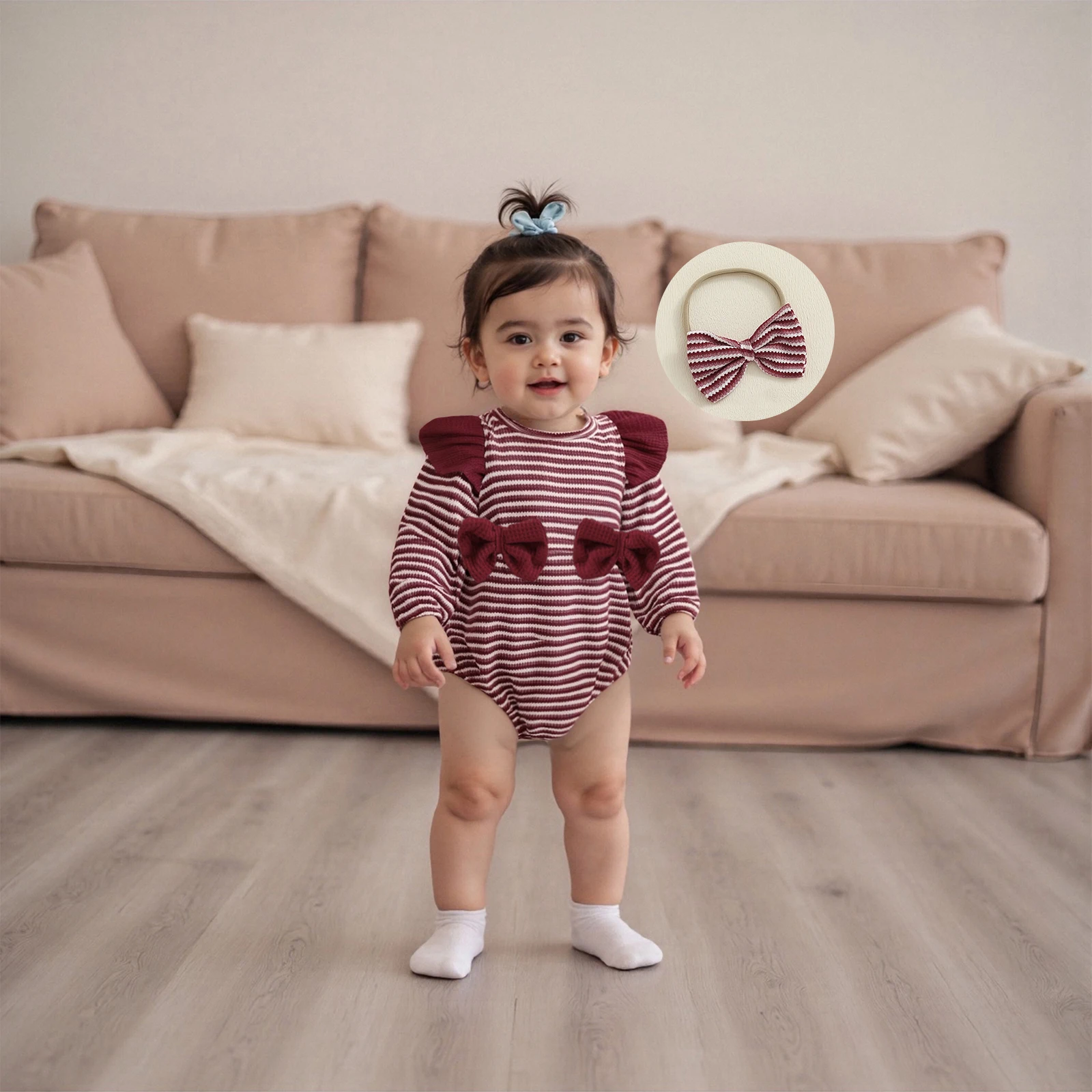Dress your little girl in style with our Baby Girls Striped Romper. Designed with a fashionable round neck and long sleeves, this adorable jumpsuit is perfect for any occasion. The playful ruffle details add a touch of charm, making it an ideal choice for both indoor and outdoor activities. Complete with a matching headband, this outfit is sure to make your baby look cute and trendy!