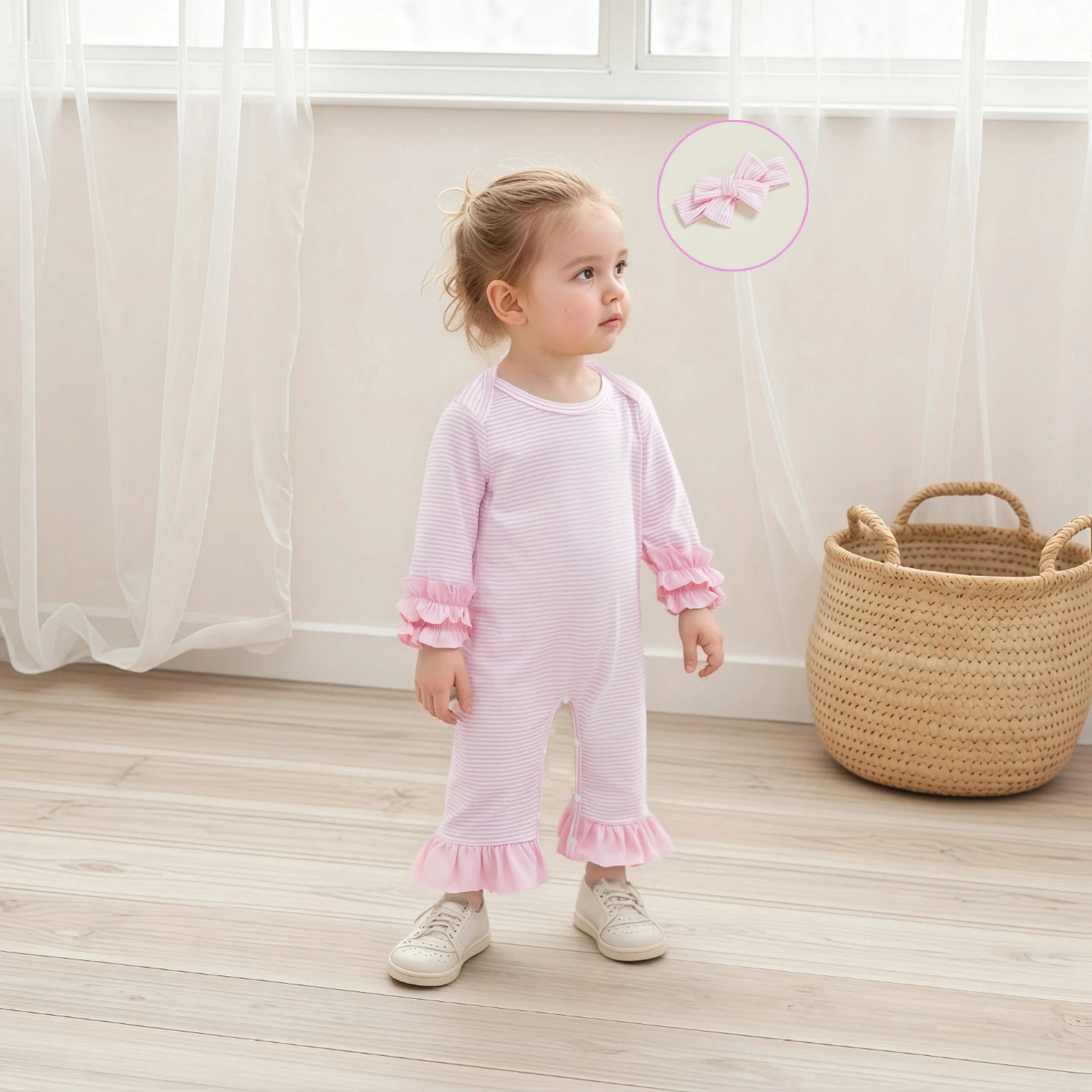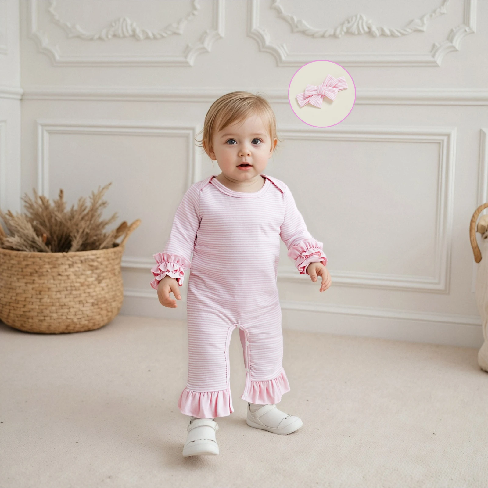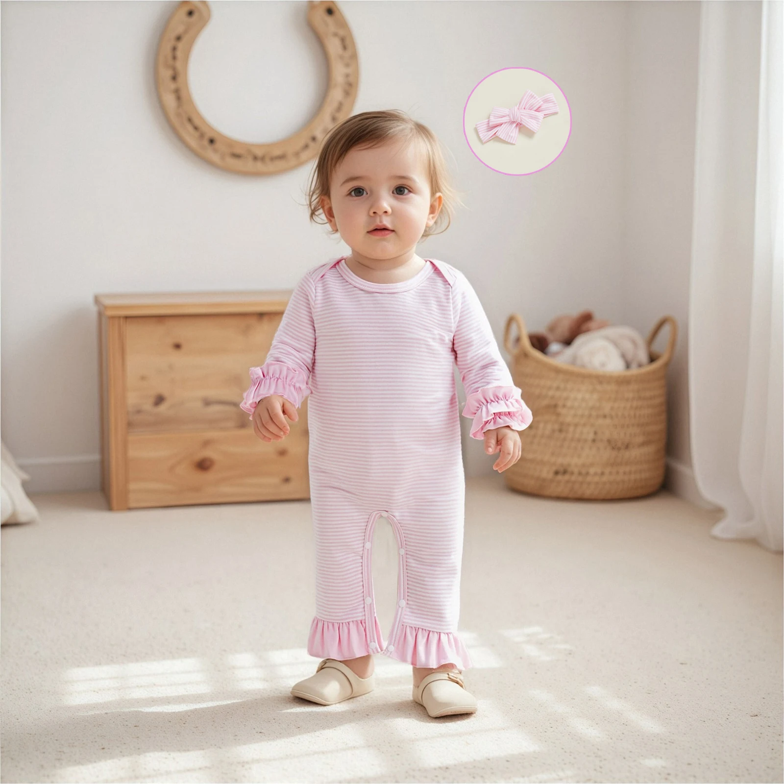 The Baby Girls Fall Romper is the perfect outfit for your little princess this season! Designed with a charming stripe print and delicate ruffles, this jumpsuit combines style and comfort to keep your baby looking adorable while enjoying maximum freedom of movement. The included headband adds an extra touch of cuteness, making it an ideal choice for daily wear or special occasions!