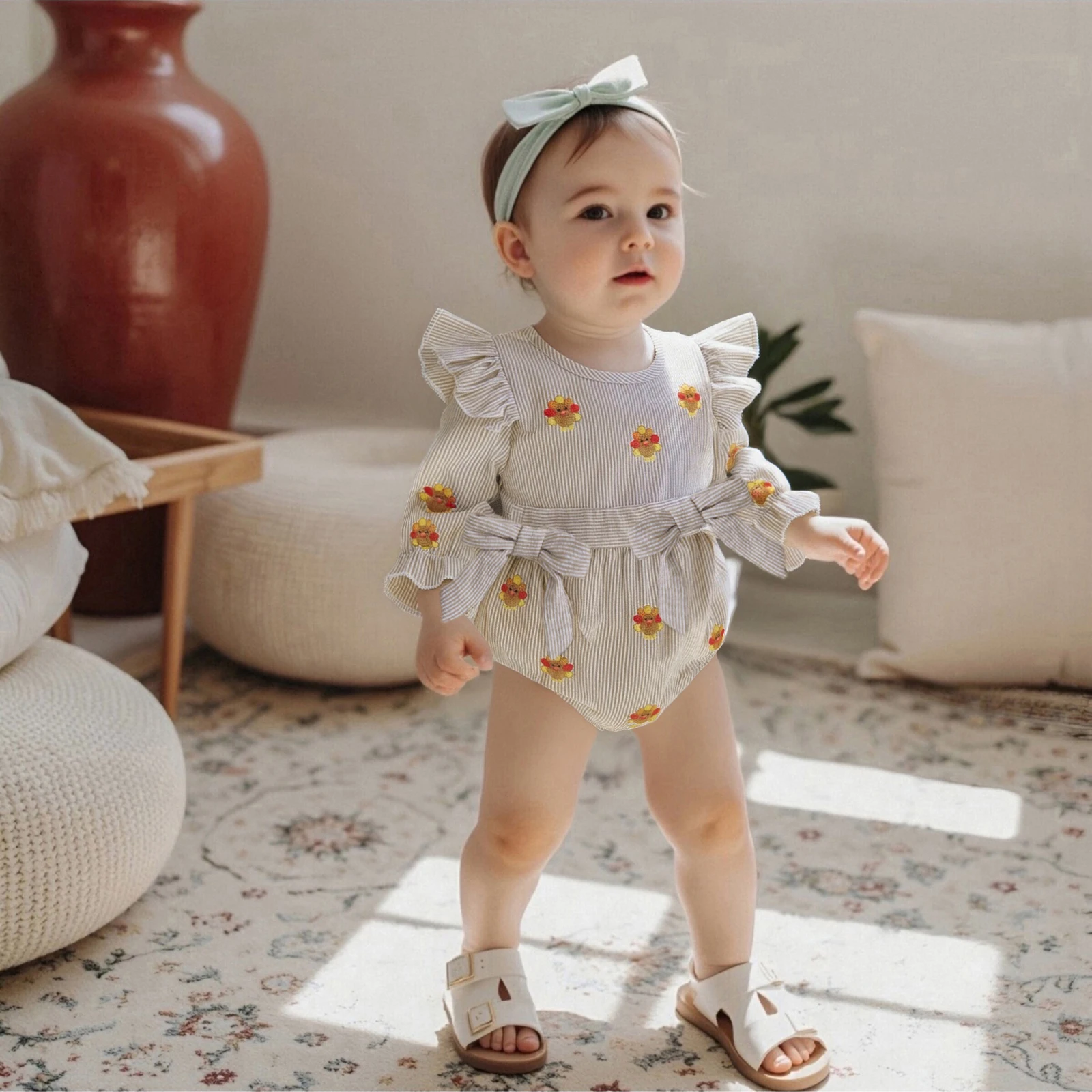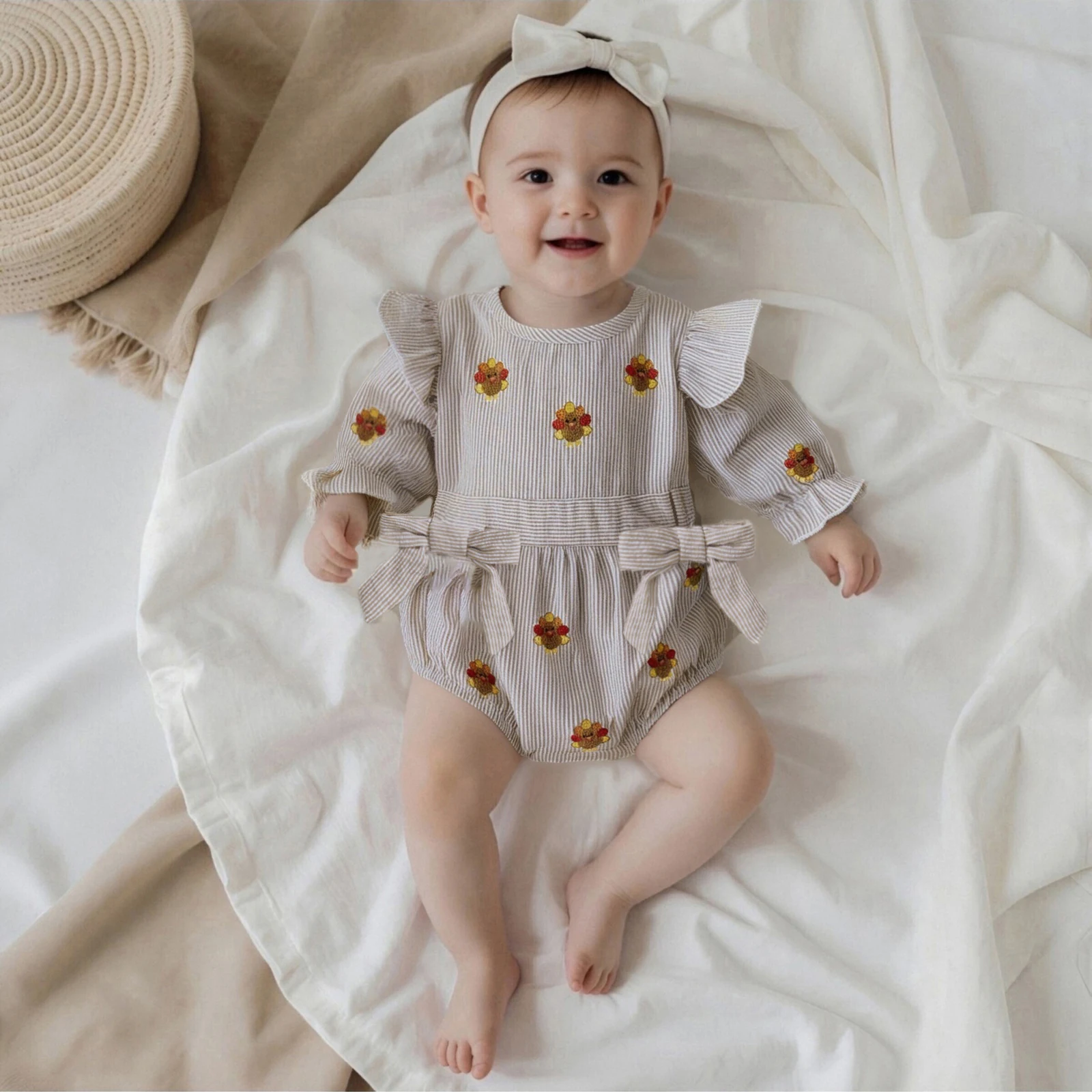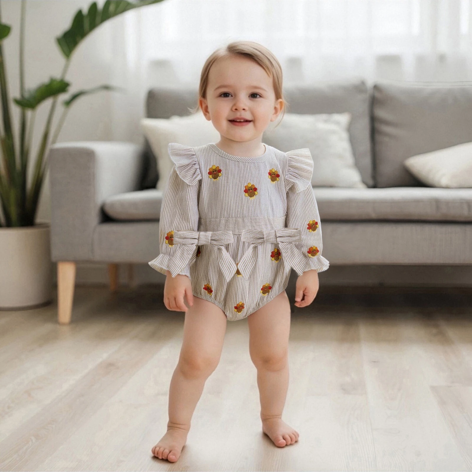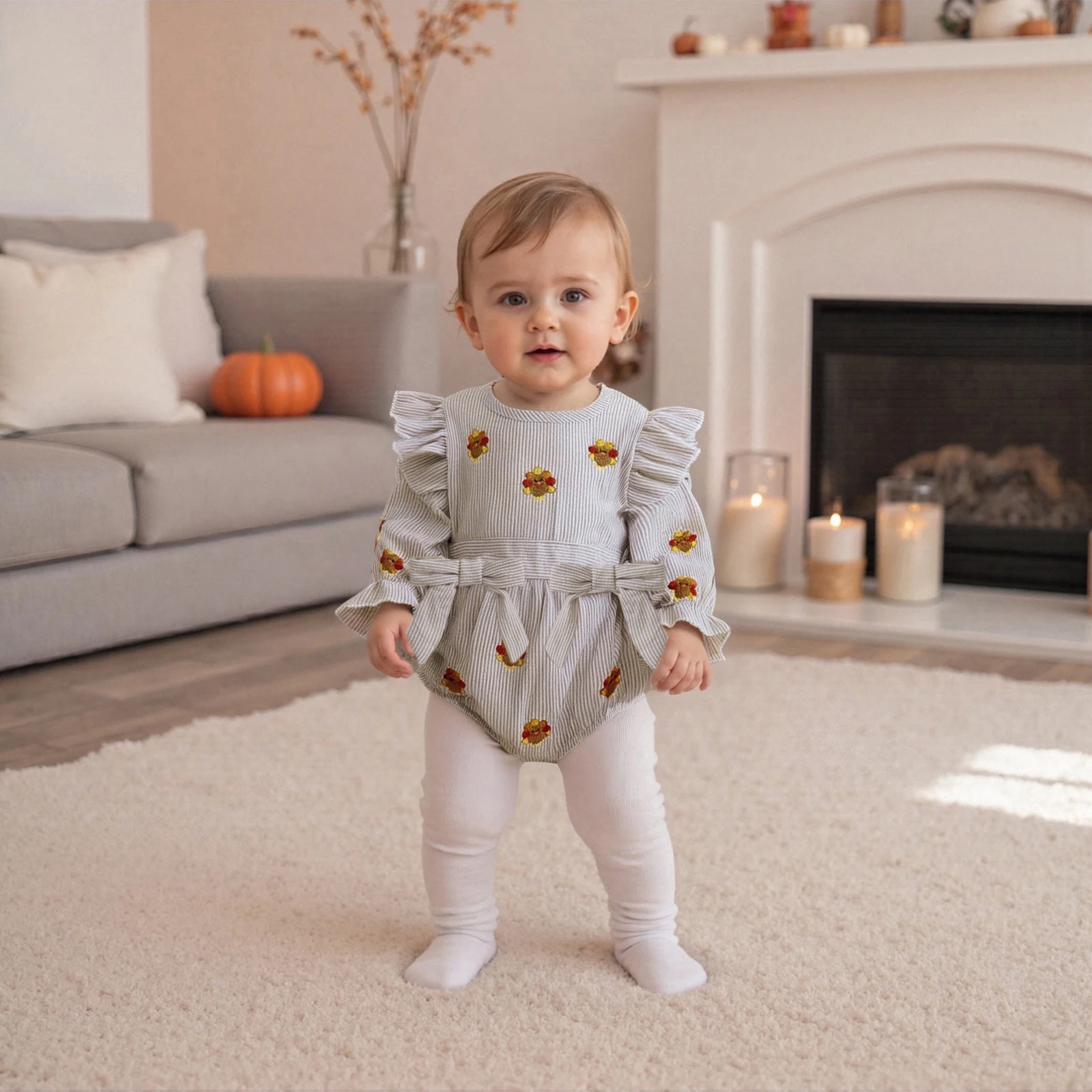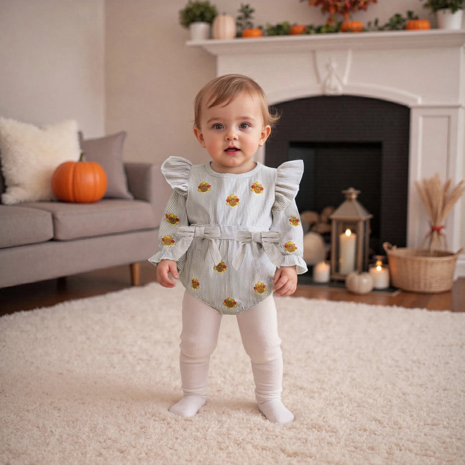 Introduce your little one to the festive spirit of Thanksgiving with our adorable Baby Girl Thanksgiving Romper. Designed with a charming turkey applique and playful striped ruffles, this long sleeve bodysuit is perfect for family gatherings, autumn outings, and cozy days at home. Crafted for comfort and style, this romper combines practicality with a cute aesthetic, making it a must-have in your baby’s wardrobe.