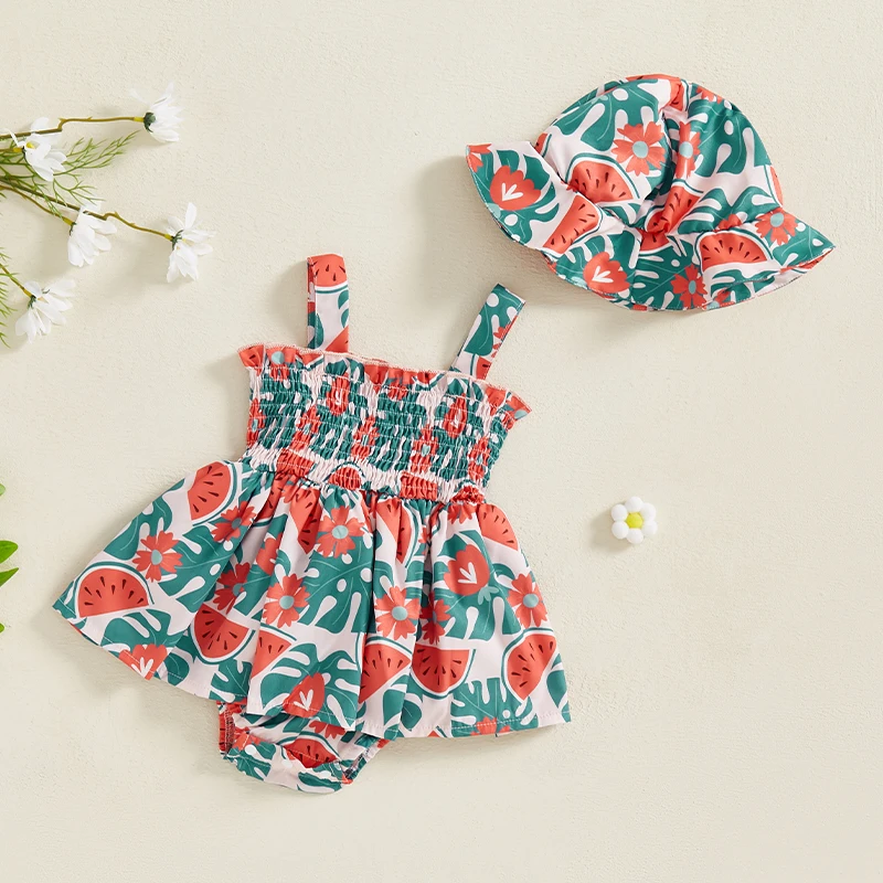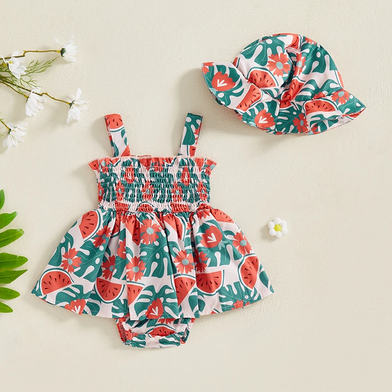 Newborn Girl Outfit: Watermelon Print Sleeveless Romper Dress with Hat